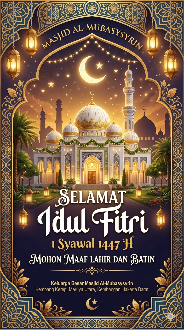 Kami pengurus DKM Masjid Jami almubasysyrin engucapkan taqabalalah wamina wamingkum, mohon maaf lahir dan batin, selamat hari raya idul Fitri 1447 H